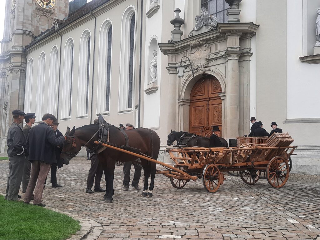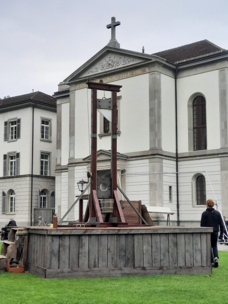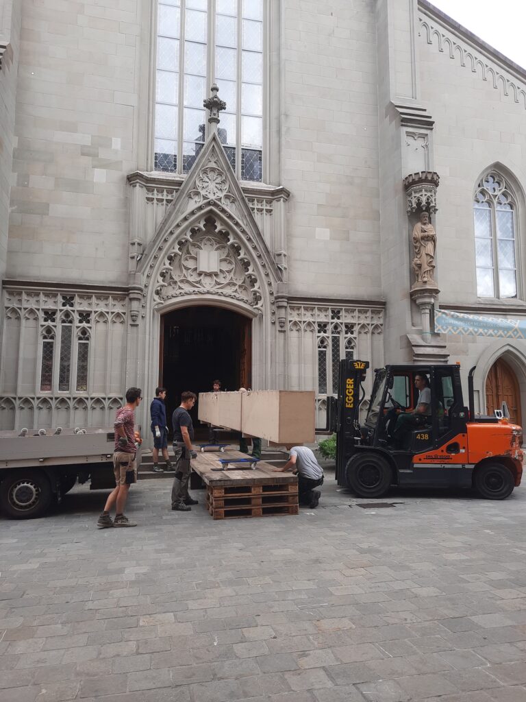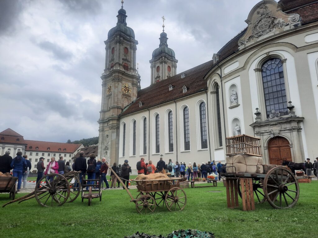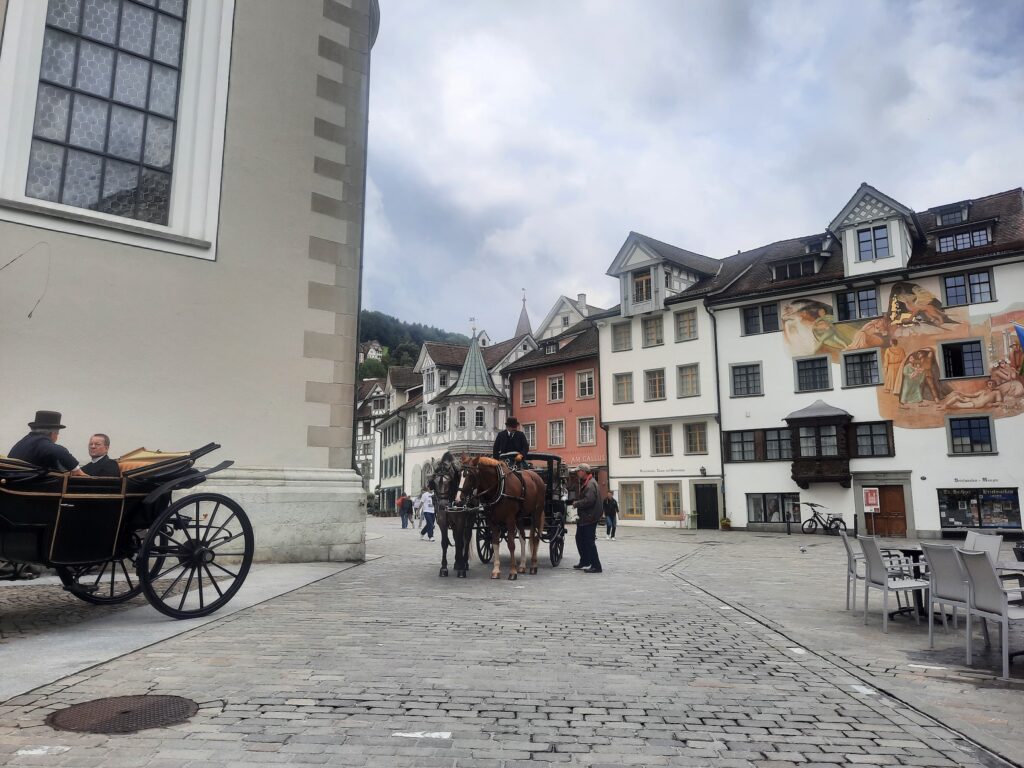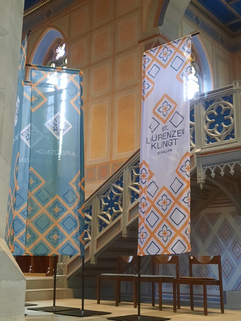 From September 3-17, a new organ built by Goll, with the particularity of being a surround organ with pipes installed on four walls, was inaugurated in the St. Laurenzen church in St. Gallen. A full music festival was set for the occasion. I arrived a few days before so that I can see and hear this incredible surround organ in prime time (the workers were still at the church when I arrived), and rest a bit from my previous trips, and my very early flight from Cologne to Zurich. I was staying at a hotel a few meters from the church, the Vadian Hotel, with a spacious room with a desk to work, and a very friendly and helpful staff. Also, I enjoy the city every time I am going, despite the cobblestones everywhere (fortunately, my wheelchair is equipped with a big front wheel that raises the tiny ones, you have seen the MTC before in posts from previous years). There was a movie shooting in the cathedral area when I arrived. Flags and banners were announcing the festival inside and outside the St. Laurenzen church.
