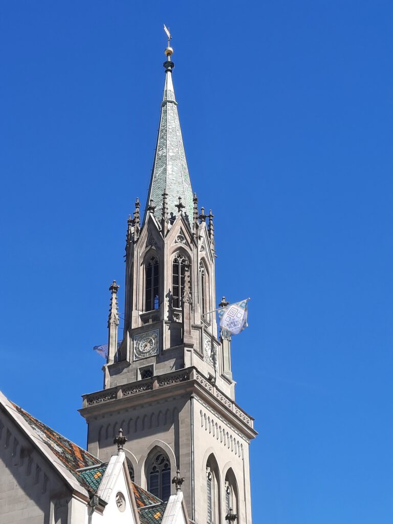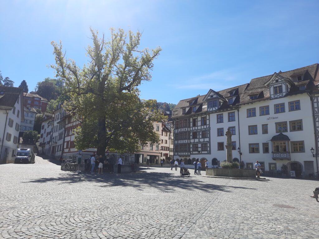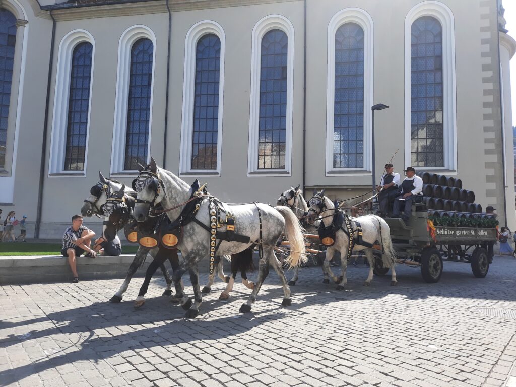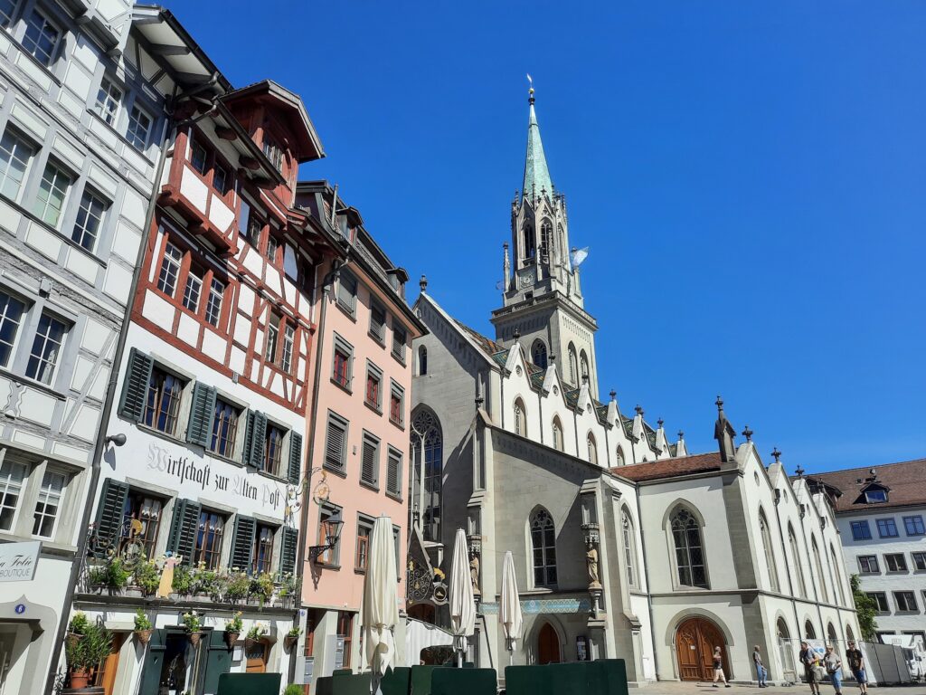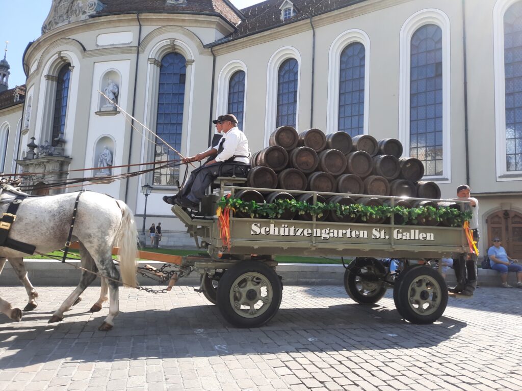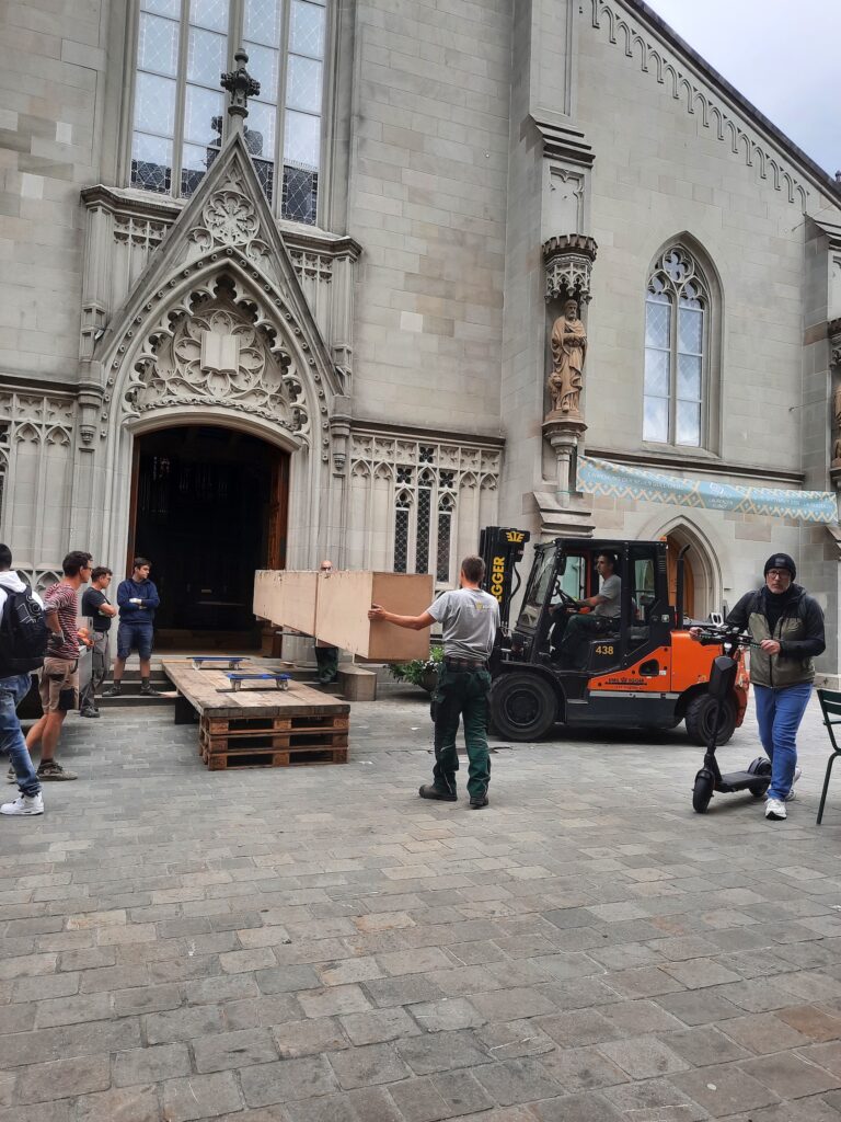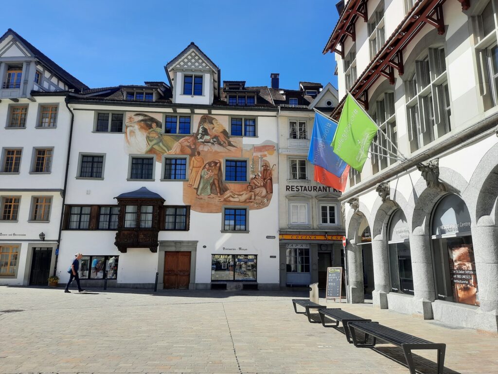From September 3-17, a new organ built by Goll, with the particularity of being a surround organ with pipes installed on four walls, was inaugurated in the St. Laurenzen church in St. Gallen. A full music festival was set for the occasion. I arrived a few days before so that I can see and hear this incredible surround organ in prime time (the workers were still at the church when I arrived), and rest a bit from my previous trips, and my very early flight from Cologne to Zurich. I was staying at a hotel a few meters from the church, the Vadian Hotel, with a spacious room with a desk to work, and a very friendly and helpful staff. Also, I enjoy the city every time I am going, despite the cobblestones everywhere (fortunately, my wheelchair is equipped with a big front wheel that raises the tiny ones, you have seen the MTC before in posts from previous years). There was a movie shooting in the cathedral area when I arrived. Flags and banners were announcing the festival inside and outside the St. Laurenzen church.
