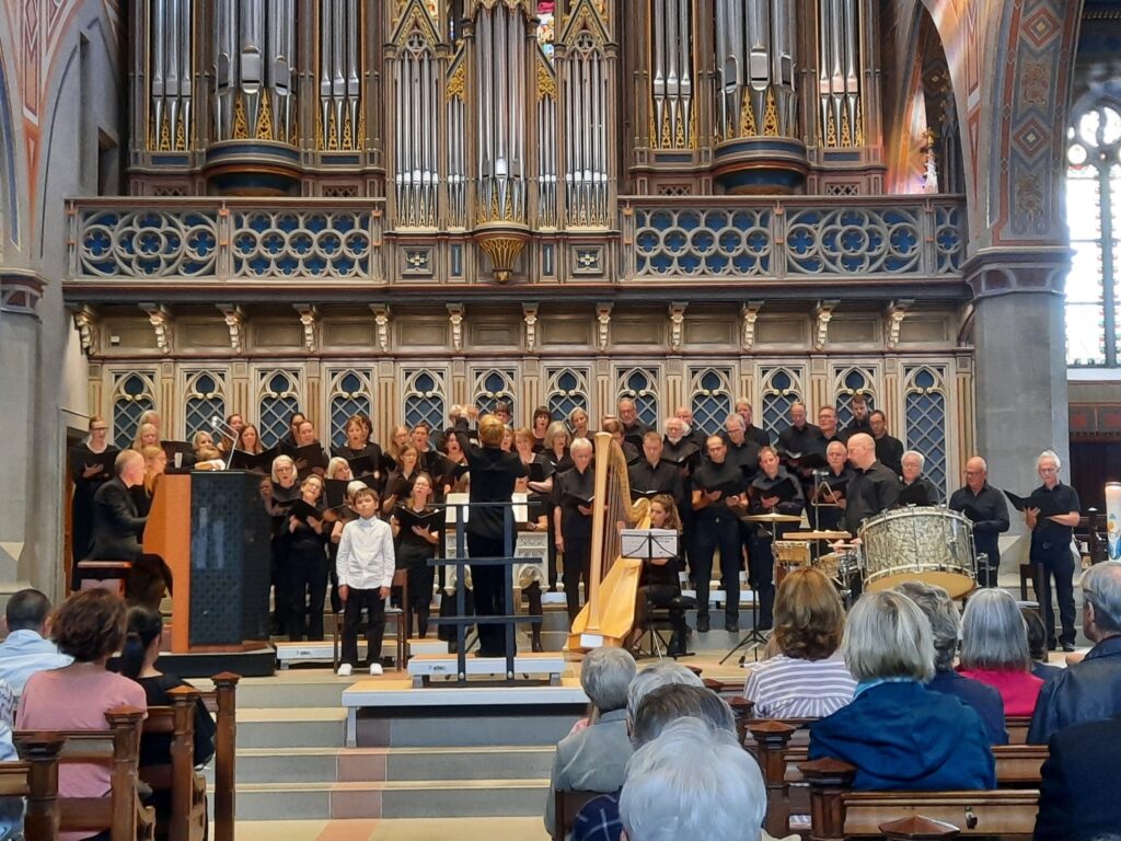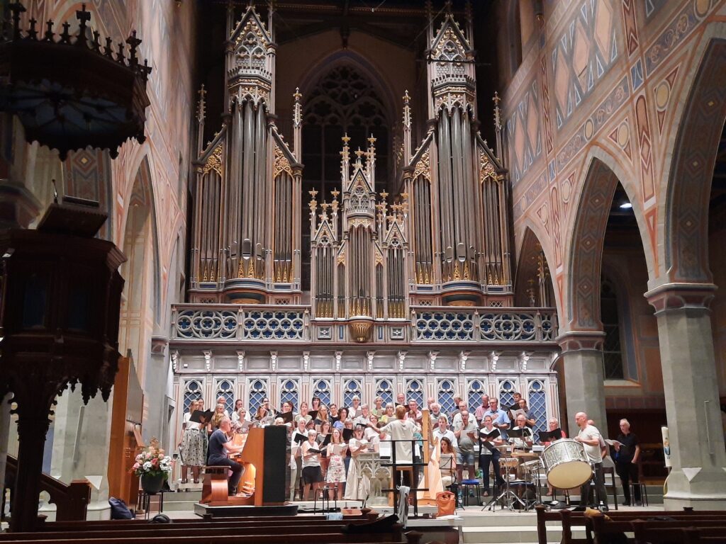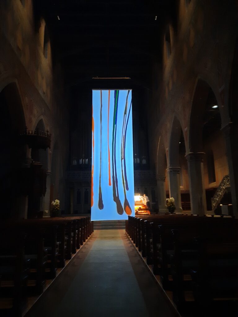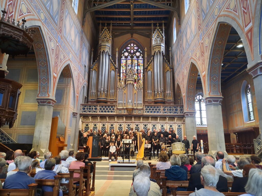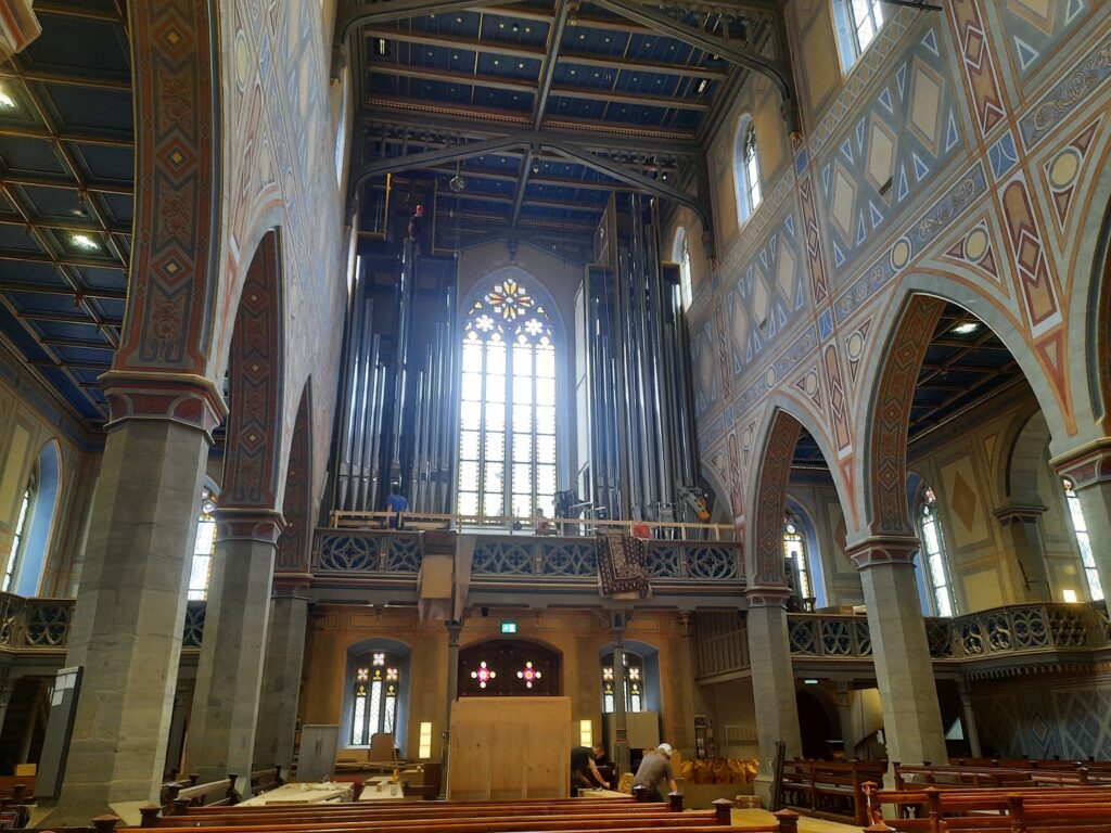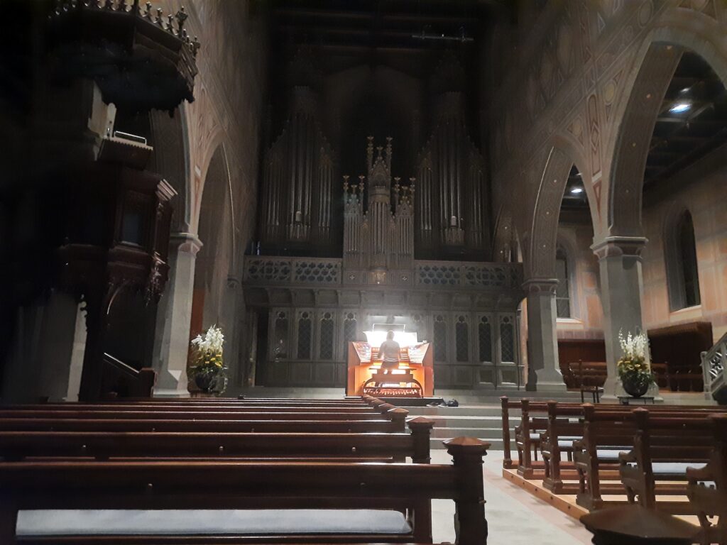 Monday, September 11th was the dress rehearsal of the second Vesper concert, Leonard Bernstein’s Chichester Psalms, performed later in the week by the Bach choir of St. Gallen, conducted by Anna Jelmorini, in a version for organ, harp, percussion, choir, and boy solo. This was a challenging rehearsal because it was the first time that the choir was performing with the new surround organ, and of course what is heard from the front of the church is different from what can be heard from the middle and from the back. My task was to give feedback on the sound level of the different registrations of the organ.