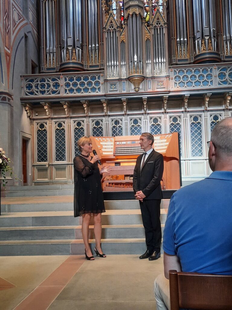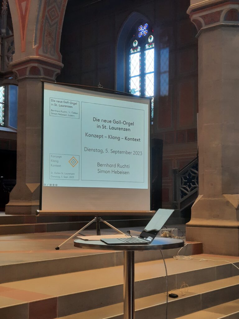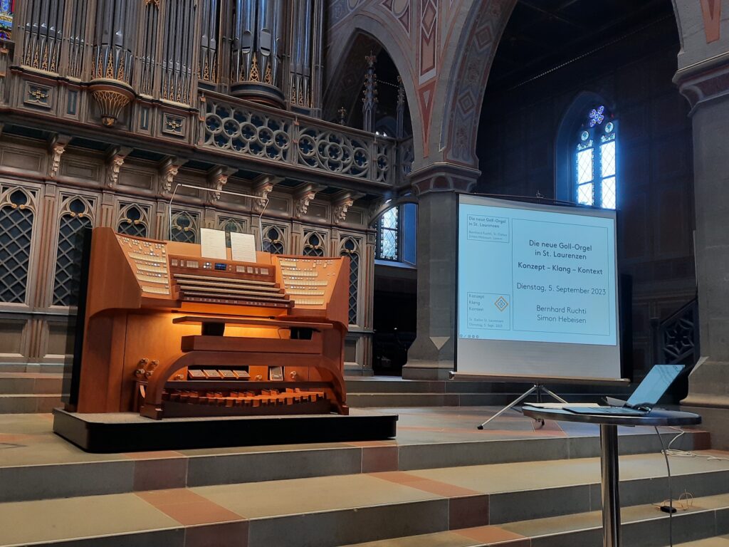On September 6th, the first Noon concert was performed by Rudolf Lutz, former organist of St. Laurenzen from 1973 to 2013, and Karl Graf, former pastor of St. Laurenzen from 1966 to 1993. On this picture they are presented by Deborah Weber, head of the organ committee.