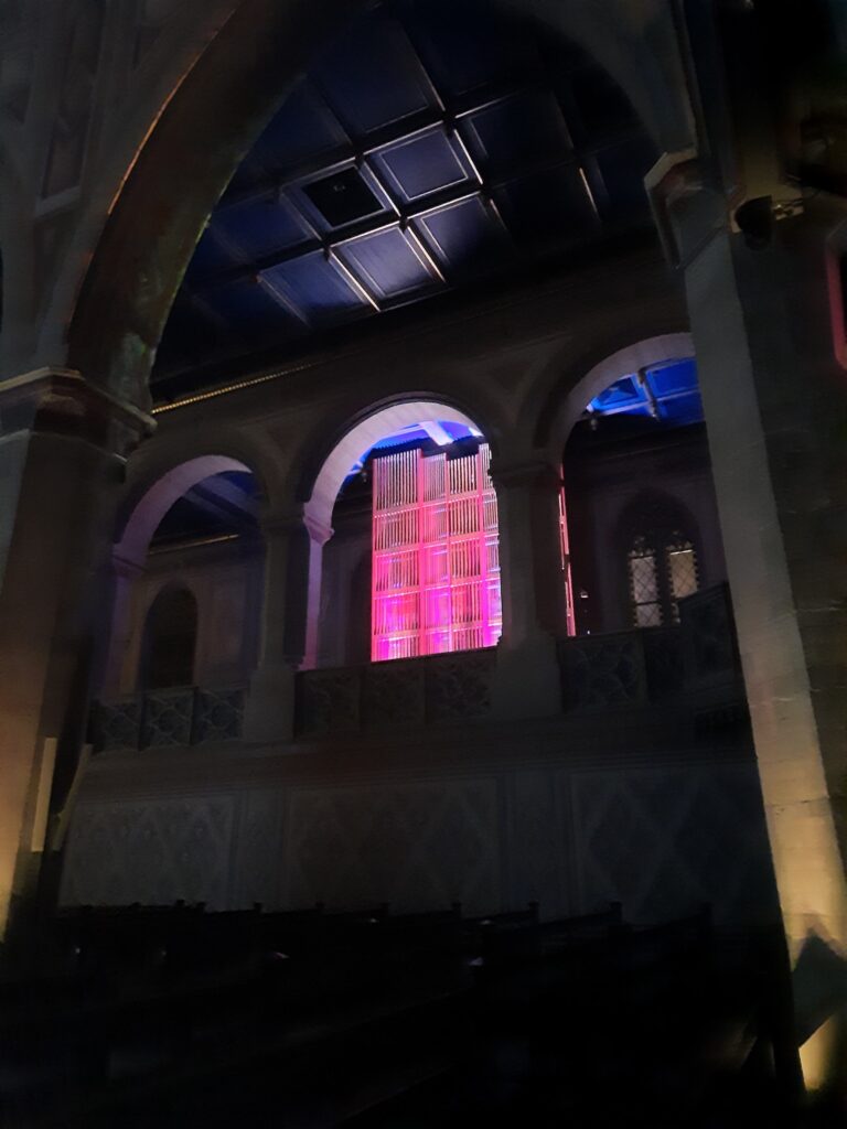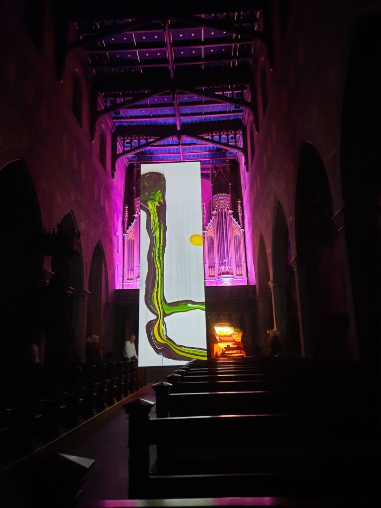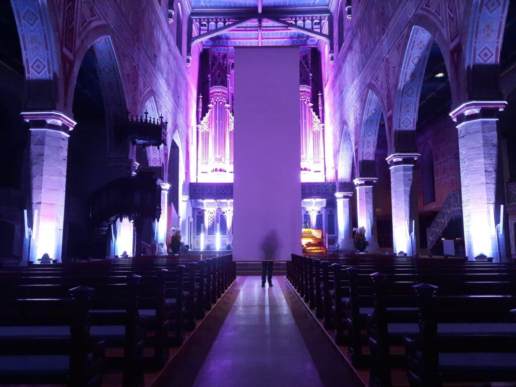 Later that evening, I attended the dress rehearsal of some of the events planned the next day for Museum Night, during which monuments and museums stay open until late at night and offer a new perspective of the place. The festival was a perfect opportunity for a nocturne event. I took better shots during the dress rehearsal, of course, since the church was empty. It gives an idea of what happened on Saturday, December 9th. This particular section was displaying the work of an artist from Geneva, Alexandra Maurer, video designer and animator, while Bernhard was playing Philip Glass’ Dance#4 at the organ.